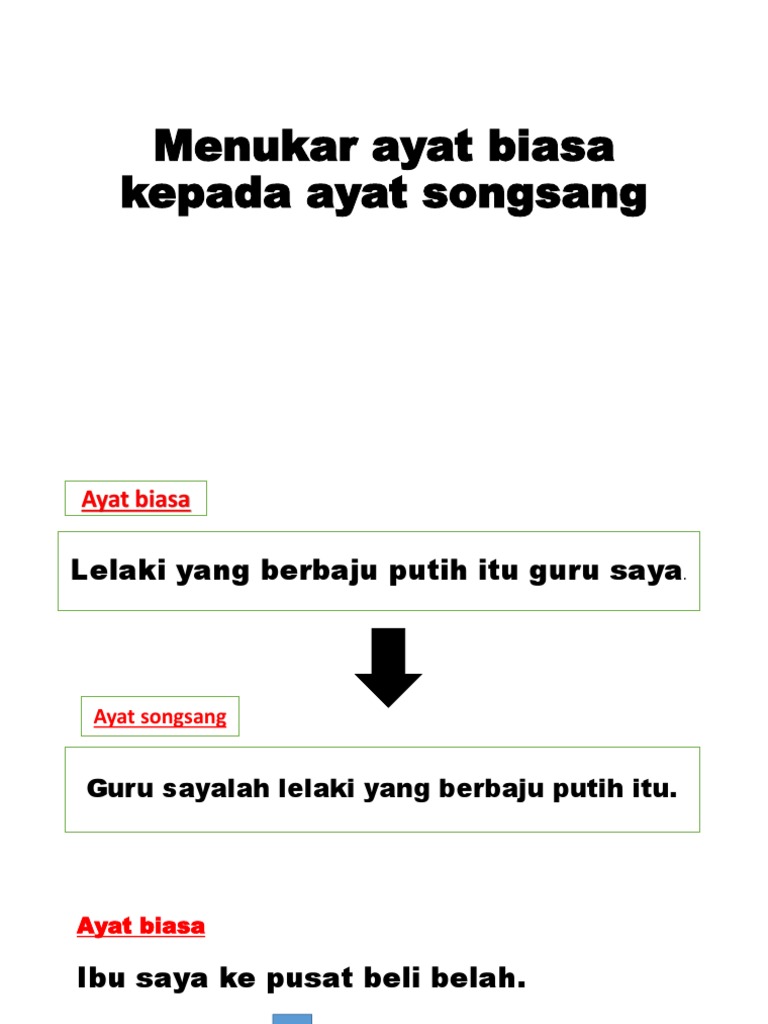 Ayat biasa kepada ayat songsang susunan ayat biasa dalam bahasa. Guru sayalah lelaki yang berbaju putih itu. Latihan pengukuhan a tukarkan ayat susunan biasa di bawah kepada ayat susunan songsang.